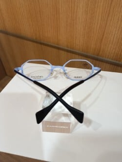 オクタゴンをベースに、天地幅を浅くして小ぶりに仕上げています。板抜きのチタンの質感により、そのシェイプが際立っています。落ち着いたブルーの発色も相まって、小粋な雰囲気かつ、涼しげに掛けられる1本です。